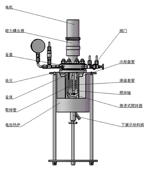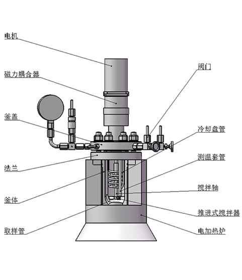 該結(jié)構(gòu)為端面磁力密封裝置,依靠兩塊強(qiáng)力磁鋼異極相吸的原理通過磁場穿透密封罩體來實(shí)現(xiàn)力矩的無接觸式傳遞,由于電機(jī)直接帶動攪拌器,故而其攪拌特點(diǎn)是低轉(zhuǎn)矩高轉(zhuǎn)速(≤1500r/min),適合攪拌低粘度(cp≤2000mpa.s)或固體顆粒物含量較少的反應(yīng)物料介質(zhì)體系。